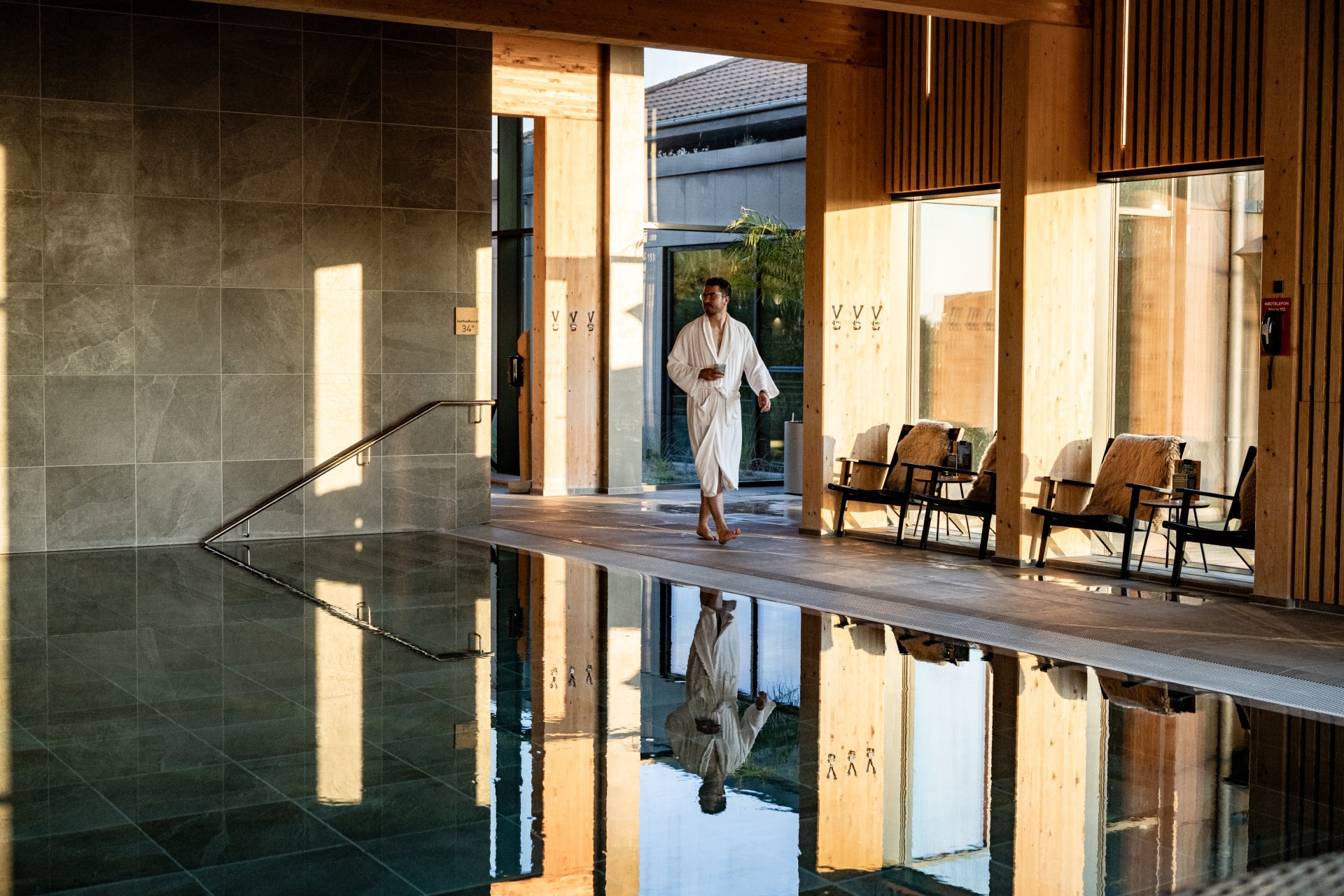 I bevæger jer mellem lune bassiner og varme saunaer. Deler stilheden i hvileområderne.