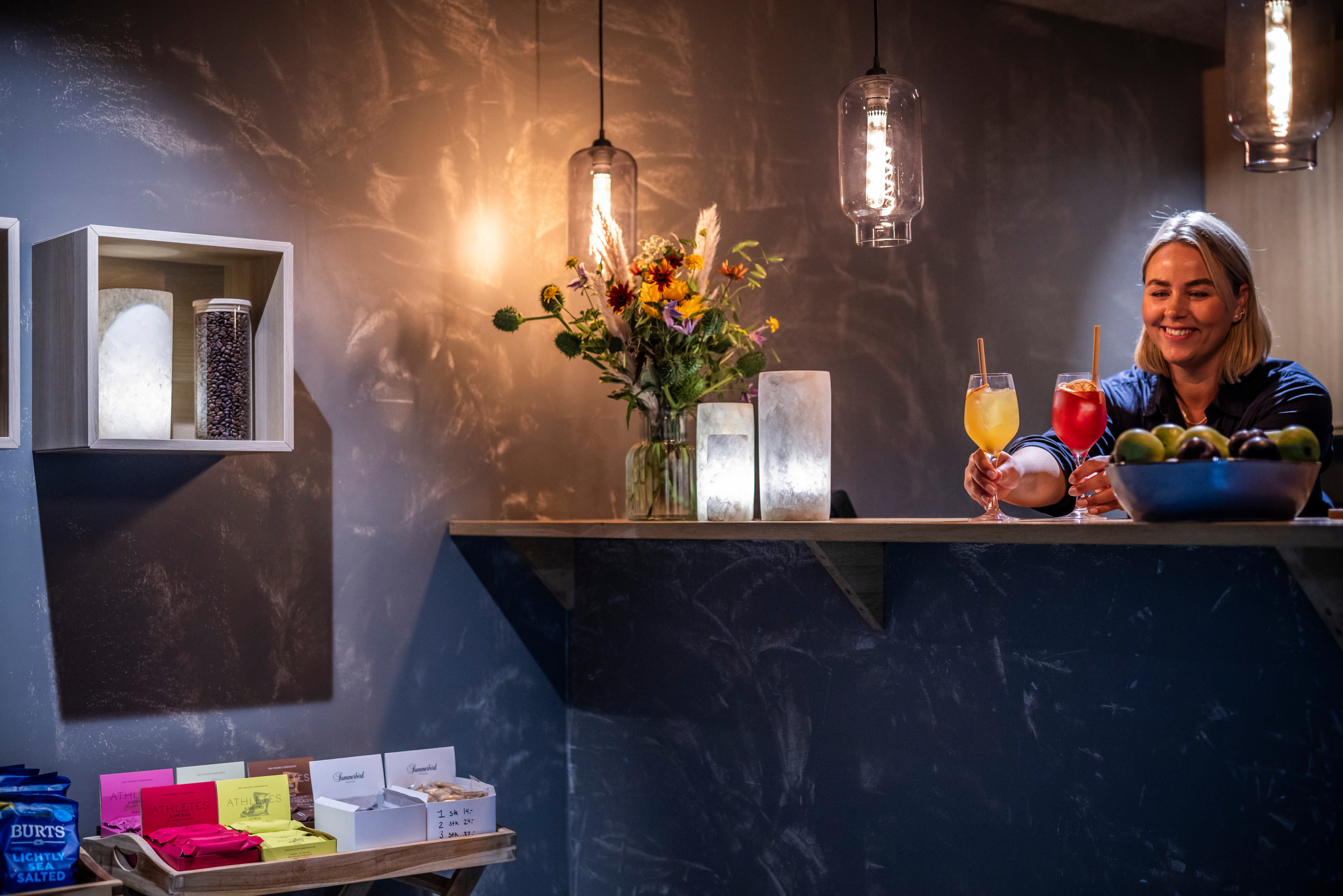 I receptionen finder du et udvalg af forskellige drikkevare og snacks, som fx chokolade, chips, sodavand, vin og slik mm.